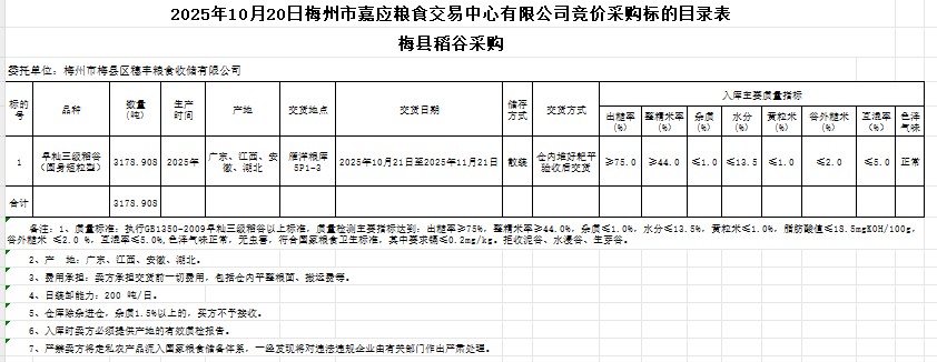 受客戶委托,梅州市嘉應(yīng)糧食交易中心有限公司定于2025年10月20日(星期一)舉辦糧食競(jìng)價(jià)交易會(huì)。梅州市梅縣區(qū)穗豐糧食收儲(chǔ)有限公司擬采購(gòu)2025年產(chǎn)早秈稻谷3178.908噸。